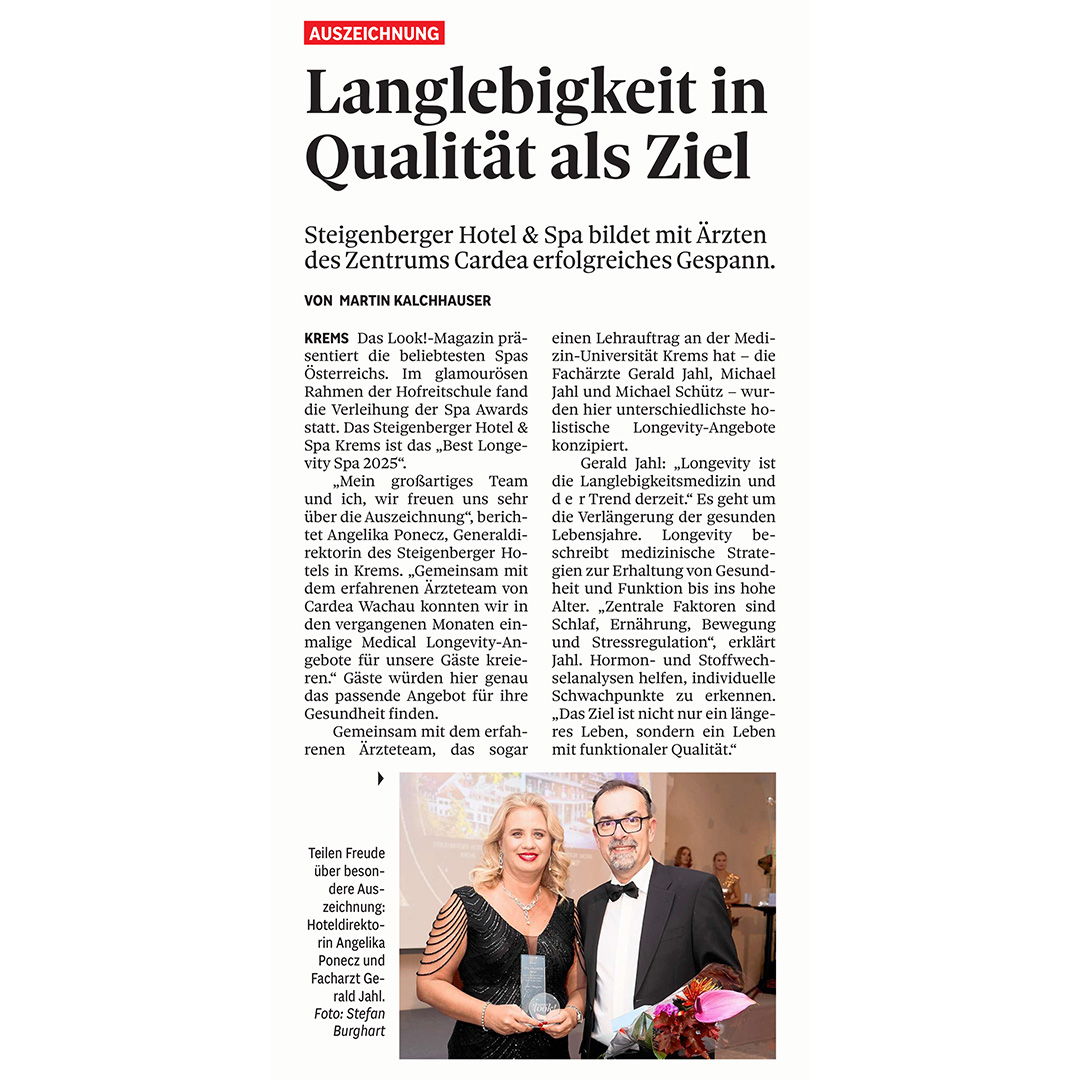 Das Look!-Magazin präsentiert die beliebtesten Spas Österreichs. Am Freitag, den 31. Oktober 2025 fand in Wien die glamouröse Verleihung der diesjährigen Look! Spa Awards statt – das Steigenberger Hotel & Spa Krems erhielt die Auszeichnung als „Best Longevity Spa 2025“.